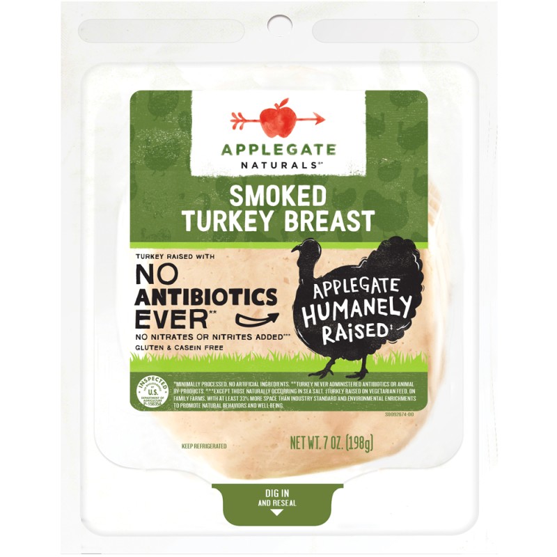 Rich and smoky, Applegate Natural Smoked Turkey Breast is a rustic take on your traditional deli sliced turkey. It's fully cooked deli turkey sandwich meat and ready to eat. It's the perfect lunch meat or cold cut, so it's the turkey your sandwich craves. We source from farms where animals are raised with care and respect. We believe this leads to great tasting products and peace of mind— all part of our mission. Changing The Meat We Eat. Fully Cooked. Whole30 Approved. Easy open. Reseal for freshness. Gluten & casein free.