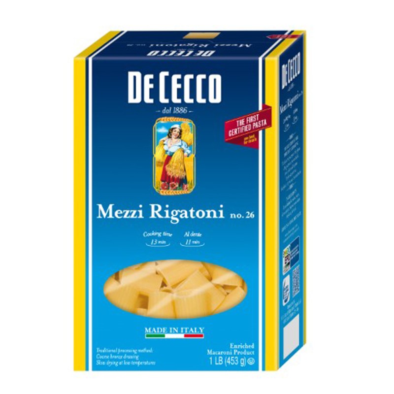 De Cecco Mezzi Rigatoni No. 26 offers all the heartiness of traditional rigatoni in a shorter, more compact form—perfect for holding rich sauces, creamy cheese blends, or chunky vegetables. Made in Italy from 100% high-quality durum wheat semolina and shaped through bronze dies, these short tubes have a rough texture that helps sauces cling to every ridge and curve.